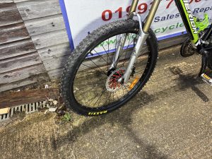 Huge Spec: Trigger gear changers, hydraulic disc brake with 180mm front disc, Marzocchi Air front suspention, Kona 6061 720mm wide bars/stem, drinks holder, Maxxis Madusa 2.1 wide tyres, comfy saddle.