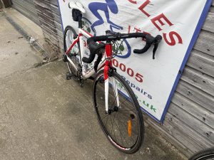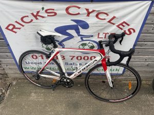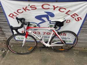 Great Spec: Shimano Tiagra group set, FSA hollowtech cranks, Shimano RS500 qr wheels, Continental Grand Prix 4 seasons K guard tyres, drinks holder, carbon seat post that’s free moving! Selle Itslia saddle, cleats peddles, seat pouch with spare tube/tools. Wil include frame pump.