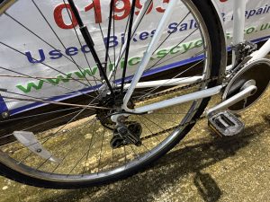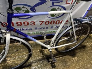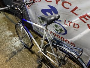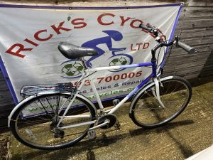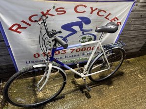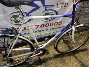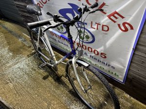 Spec: Thumb gear changers, full mudguards, chain ring guard, rear rack, upgraded tyres, very comfy saddle.