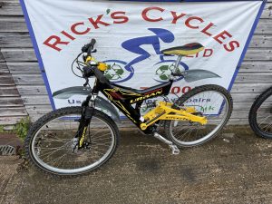 Spec: Trigger gear changers, full suspension, disc front brake, comfy sadle, mudguard, chain ring guard.