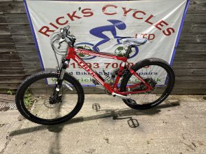 Great Spec: Shimano Deore trigger gear changer, Shimano hydraulic Deore disc brakes, Fox Air Vanilla rear shock, Rocker Link, RockShox Tora front suspension, HollowTech bottom bracket, Shimano cranks, qr wheels, drinks holder, chain ring guard.