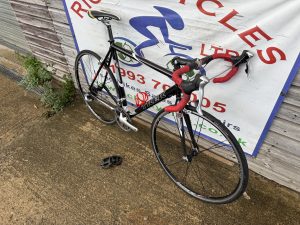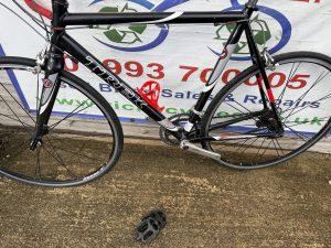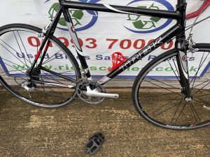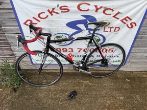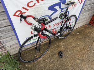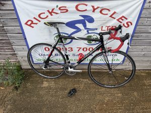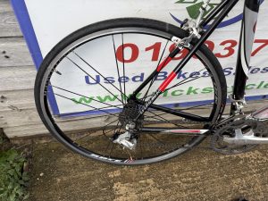 Spec: Shimano Tiagra gear changers/front mech/Tiagra rear mech, Bontranger carbon fork, carbon seat post/stem/bars/qr front/rear wheels, long post, drinks holder,